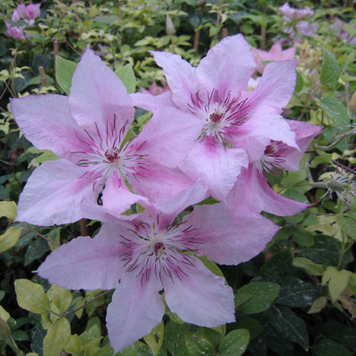 Компактный сорт, высотой 2-3 м. Цветки большие до 15 см в диаметре, розовые с яркой розовой полоской посередине лепестков. Цветет обильно с июня по сентябрь. Обрезка сильная (III группа).